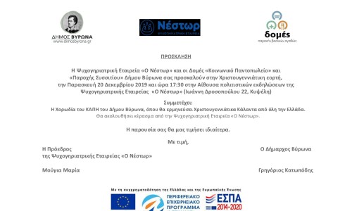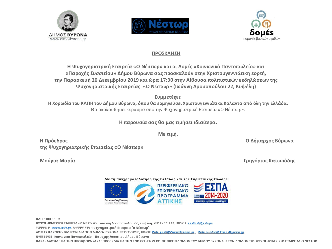 Οι Δομές Παροχής Βασικών Αγαθών: «Κοινωνικό Παντοπωλείο» και «Δομή Παροχής Συσσιτίου» του Δήμου Βύρωνα σε συνεργασία με την Ψυχογηριατρική Εταιρεία «ο Νέστωρ» και τα ΚΑΠΗ του Δήμου Βύρωνα, συνδιοργανώνουν Χριστουγεννιάτικη Εκδήλωση την Παρασκευή 20-12-2019 και ώρα 17:30 στα γραφεία της Εταιρείας «ο Νέστωρ» (Δροσοπούλου 22).