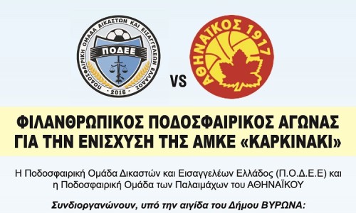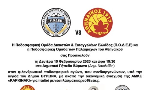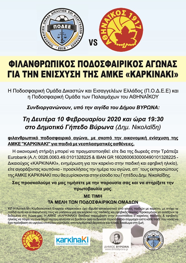 Η Ποδοσφαιρική Ομάδα Δικαστών & Εισαγγελέων Ελλάδος (Π.Ο.Δ.Ε.Ε.) και η Ποδοσφαιρική Ομάδα των Παλαιμάχων του Αθηναϊκού σας προσκαλούν τη Δευτέρα 10 Φεβρουαρίου 2020 και ώρα 19.30 στο Δημοτικό Γήπεδο Βύρωνα «Δημήτρης Νικολαΐδης» στον φιλανθρωπικό ποδοσφαιρικό αγώνα, που συνδιοργανώνουν, υπό την αιγίδα του Δήμου Βύρωνα, με σκοπό την οικονομική ενίσχυση της ΑΜΚΕ «ΚΑΡΚΙΝΑΚΙ» για παιδιά με νεοπλασματικές ασθένειες.