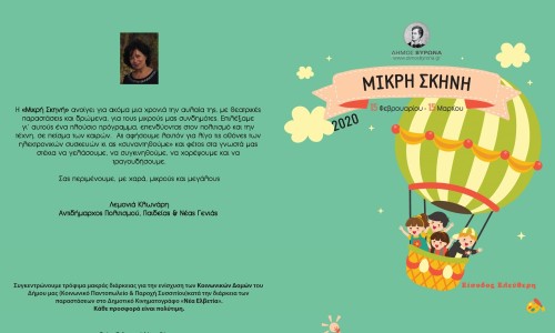 Για ακόμη μια χρονιά η «Μικρή Σκηνή», ένας από τους παλαιότερους και πιο επιτυχημένους θεσμούς στο Δήμο μας, υποδέχεται τους μικρούς και μεγάλους φίλους της, τα Σαββατοκύριακα του Φεβρουαρίου και Μαρτίου.