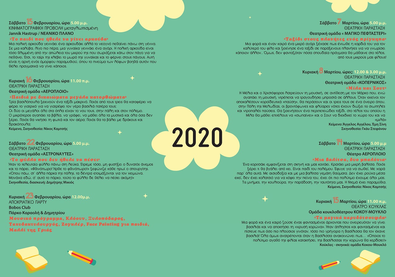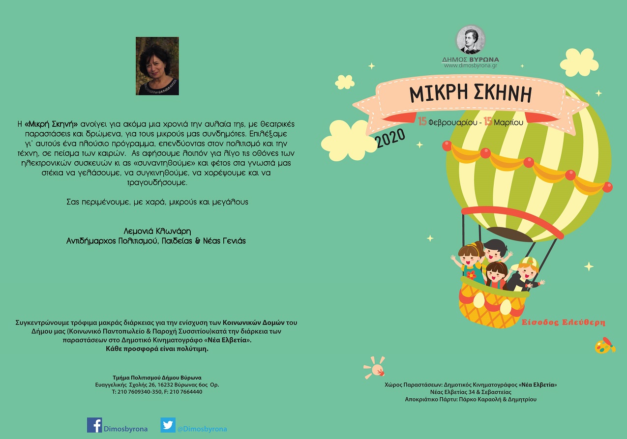 Το Τμήμα Πολιτισμού του Δήμου Βύρωνα πιστό στο ετήσιο αυτό ραντεβού με τα παιδιά και συνεπής στα ποιοτικά θεάματα που διαπλάθουν αλλά και διασκεδάζουν τους μικρούς μας φίλους, ετοίμασε ένα πρόγραμμα κινηματογραφικών και θεατρικών παραστάσεων αλλά και ένα μεγάλο αποκριάτικο πάρτι και προσκαλεί όλους τους φίλους της Μικρής Σκηνής να τα παρακολουθήσουν, να διασκεδάσουν και να συμμετέχουν στα διασκεδαστικά δρώμενα.