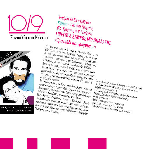 Το επόμενο ραντεβού μας είναι απόψε, 10 Σεπτέμβρη, στο Κέντρο του Βύρωνα, στην πλατεία Σμύρνης με τη συναυλία "Τραγούδι και φύγαμε..." με τον Γιώργο και Σταύρο Μυλωναδάκη. Ώρα έναρξης 20:00- είσοδος ελεύθερη.