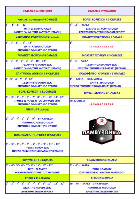 Ο Δήμος Βύρωνα σε συνεργασία με το Γραφείο Φυσικής Αγωγής και τη Σχολή Επιστήμης Φυσικής Αγωγής & Αθλητισμού (ΣΕΦΑΑ) του Καποδιστριακού Πανεπιστημίου Αθηνών διοργανώνει για έκτη συνεχόμενη χρονιά τους Σχολικούς Αθλητικούς Αγώνες «Παμβυρώνεια 2020» (16 Μαρτίου).