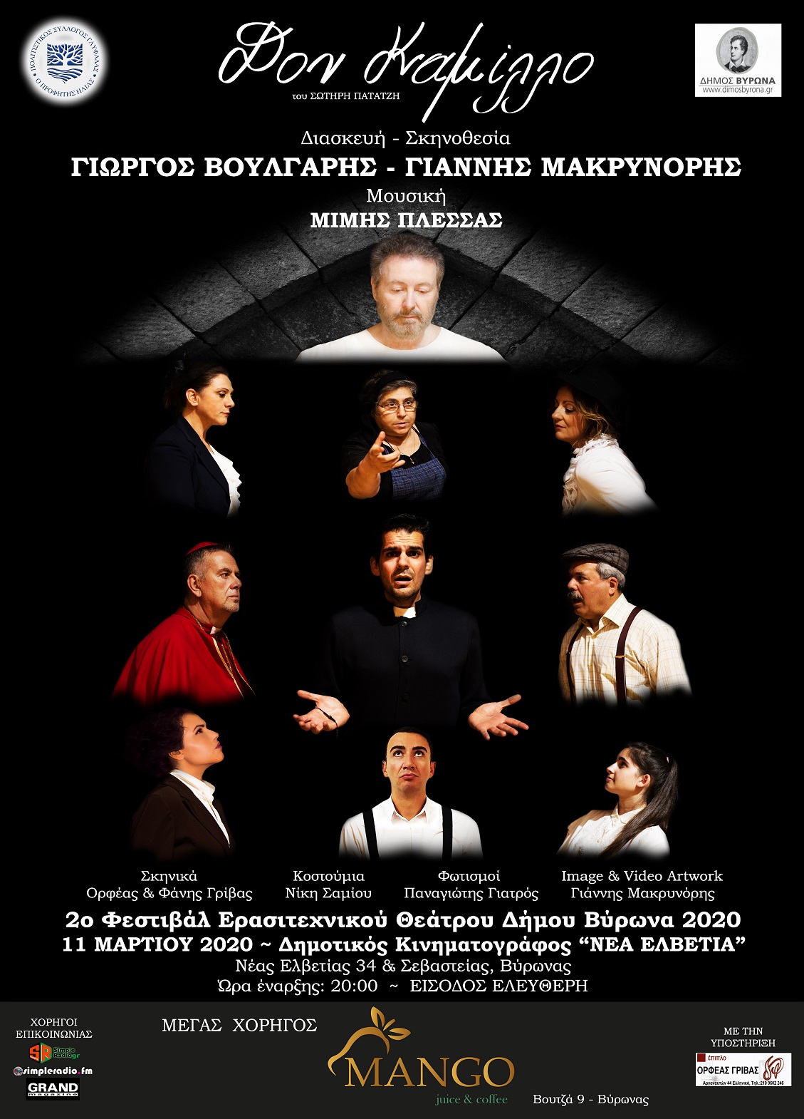 Στο πλαίσιο του 2ου Φεστιβάλ Ερασιτεχνικού Θεάτρου του Δήμου Βύρωνα την Τετάρτη 11 Μαρτίου, παρουσιάζεται από τον Πολιτιστικό Σύλλογο Γλυφάδας «Ο Προφήτης Ηλίας» η θεατρική παράσταση «Δον Καμίλο», στο Δημοτικό Κινηματογράφο «Νέα Ελβετία» (Ν. Ελβετίας 34 & Σεβαστείας) και ώρα 20.00.