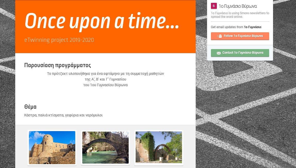 Το 1ο Γυμνάσιο Βύρωνα ολοκλήρωσε με επιτυχία το ευρωπαϊκό πρόγραμμα eTwinning "Once upon a time..." με θέμα τα κάστρα, τα παλιά κτίσματα, τα γεφύρια και τους νερόμυλους. Στο πρόγραμμα συμμετείχαν 10 χώρες και 32 σχολεία από την Ευρώπη και την Τουρκία.
