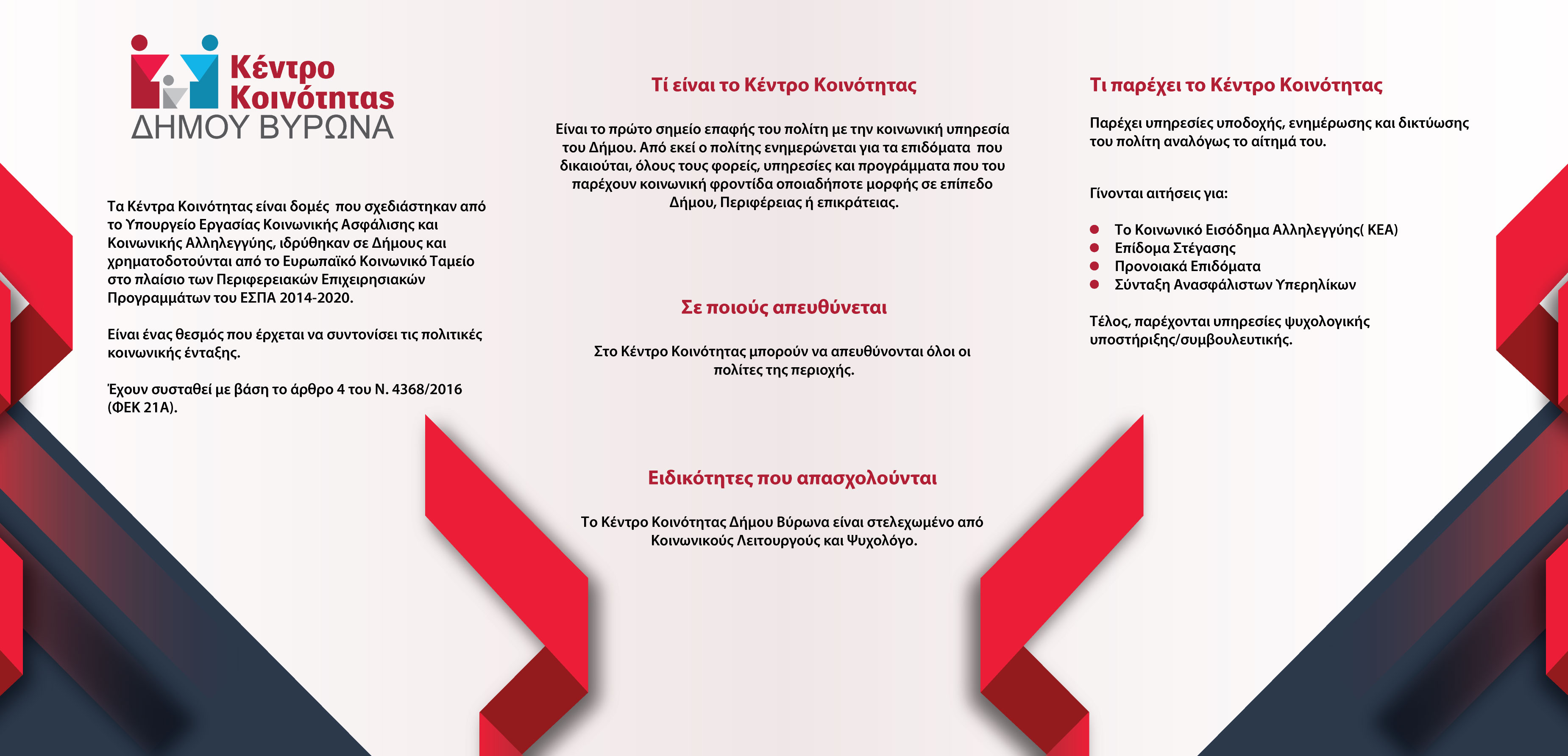 Το Κέντρο Κοινότητας του Δήμου Βύρωνα είναι στελεχωμένο από Κοινωνικούς Λειτουργούς και Ψυχολόγο.