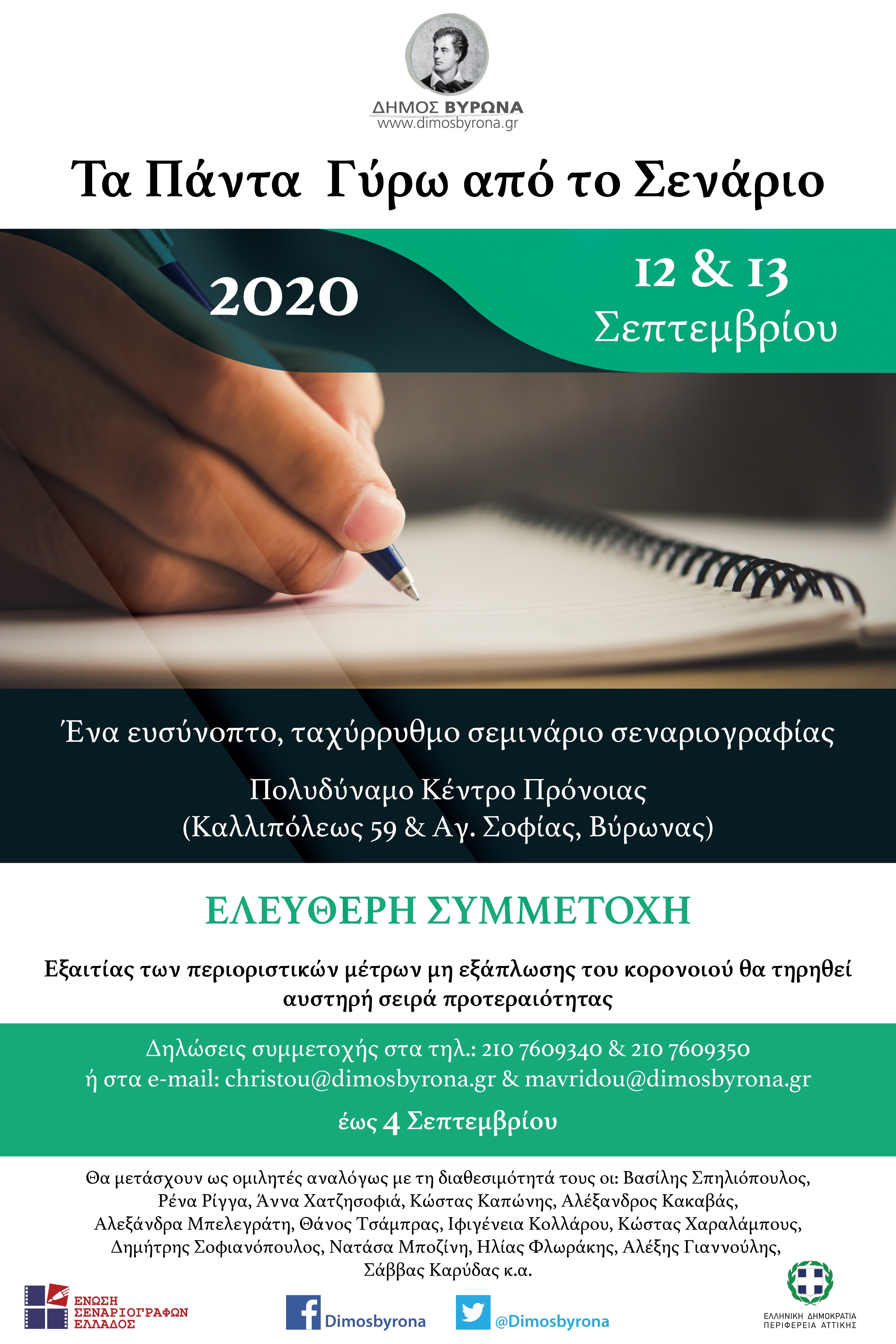 Το τμήμα Πολιτισμού του Δήμου Βύρωνα διοργανώνει σεμινάριο με τίτλο «Τα πάντα γύρω από το σενάριο» σε συνεργασία με την Ένωση Σεναριογράφων Ελλάδος και την Περιφέρεια Αττικής, το Σάββατο 12 και την Κυριακή 13 Σεπτεμβρίου 2020.