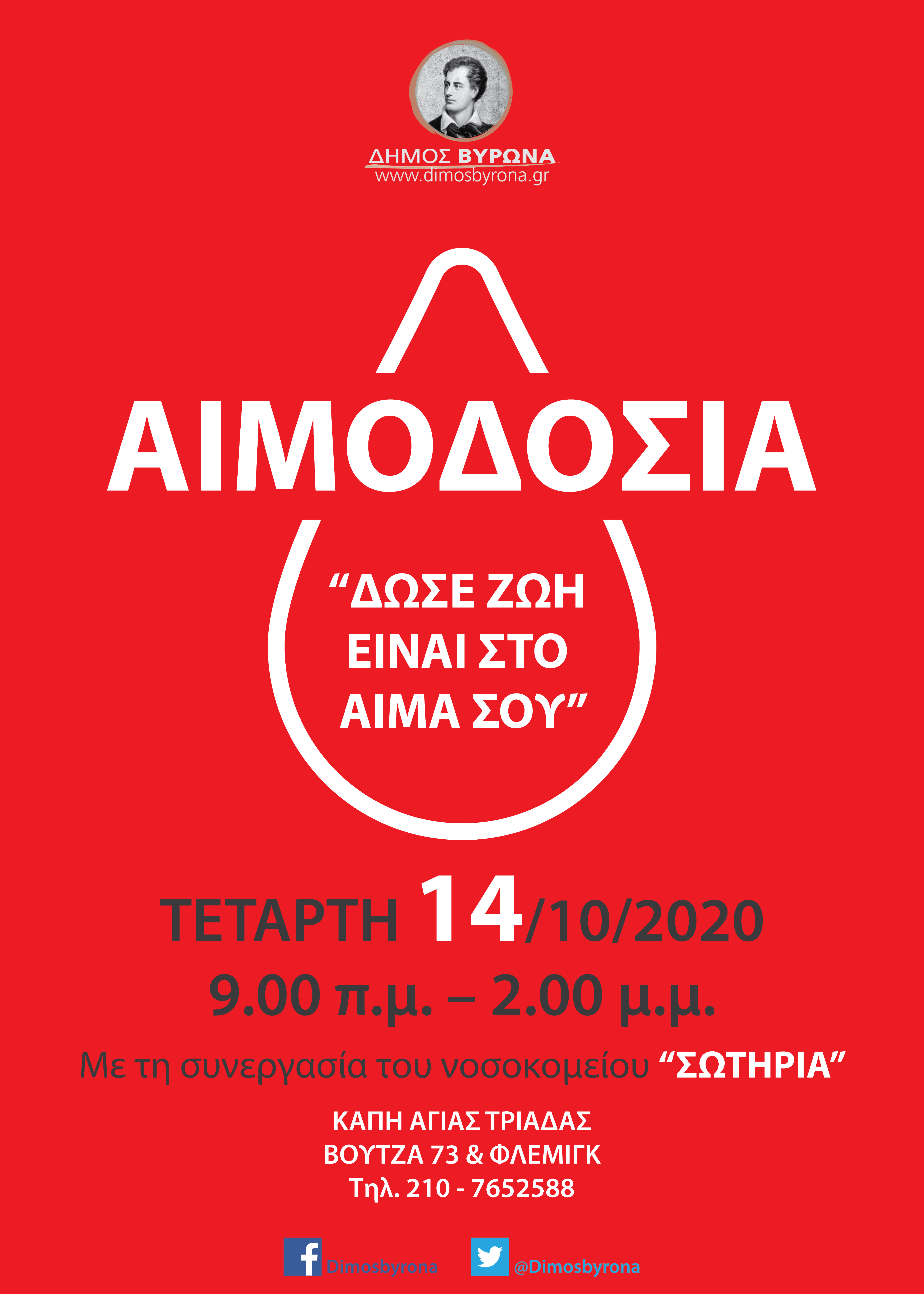 Ο Δήμος Βύρωνα σε συνεργασία με το Γ.Ν.Α «ΣΩΤΗΡΙΑ», θα πραγματοποιήσει Εθελοντική Αιμοδοσία την Τετάρτη 14/10/2020 και ώρες 9:00 – 14:00 στο Κ.Α.Π.Η Αγίας Τριάδας, Βουτζά 73 & Φλέμινγκ (Εντευκτήριο Προσκόπων).