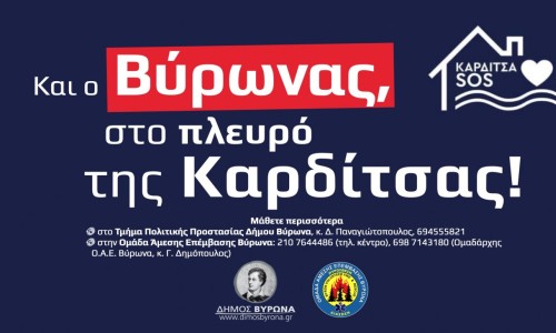 Μεταβαίνει αύριο Σάββατο 3/10 στην Καρδίτσα αντιπροσωπεία του Δήμου Βύρωνα με επικεφαλής τον Δήμαρχο Γρηγόρη Κατωπόδη και τη συμμετοχή του Αντιδημάρχου Θέμη Τέγου, του προέδρου της εθελοντικής ομάδας πολιτικής Προστασίας Σταύρου Σαλαγιάννη και εργαζόμενων του Δήμου, προκειμένου να μεταφέρει τρόφιμα και είδη πρώτης ανάγκης στους δοκιμαζόμενους κατοίκους της περιοχής που επλήγησαν από την κακοκαιρία Ιανός.