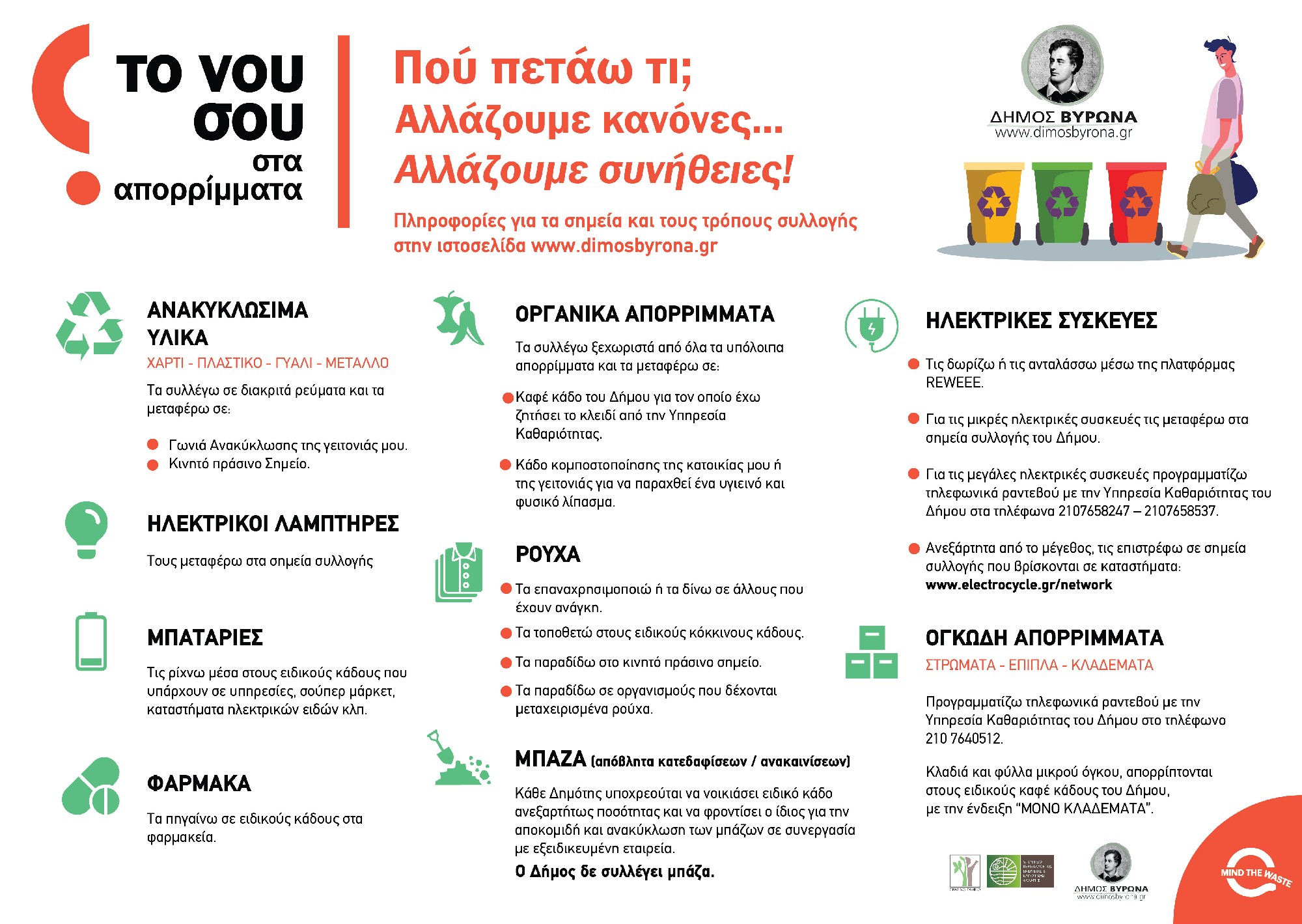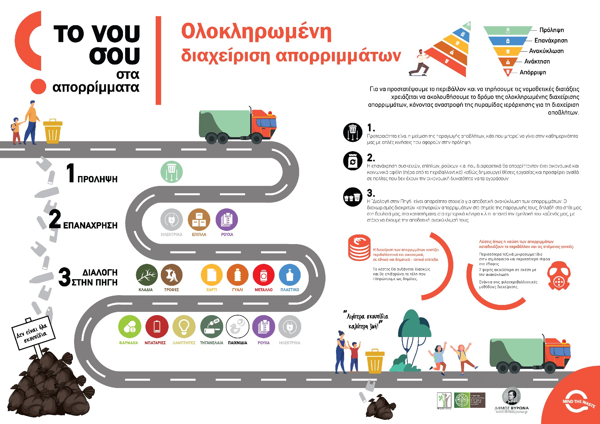 Σήμερα, η διαλογή στην πηγή είναι η κατεύθυνση από την Ευρωπαϊκή και Εθνική νομοθεσία, αν και στην πράξη δεν έχουν ληφθεί τα απαραίτητα μέτρα ώστε να μπορεί να εφαρμοστεί αποτελεσματικά και καθολικά. Ο Δήμος Βύρωνα, οι εργαζόμενοι και οι πολίτες συνεχίζουν να πρωτοπορούν και αποδεικνύουν έμπρακτα ότι η πρόληψη στην παραγωγή απορριμμάτων και η διαλογή στην πηγή, είναι η λύση για την ορθή διαχείριση των απορριμμάτων.