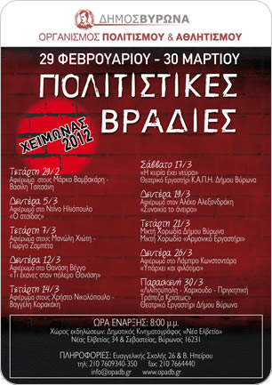 -- πατήστε εδώ και κατεβάστε σε μορφή .pdf το πρόγραμμα των Πολιτιστικών Βραδιών 2012 (11 MB)