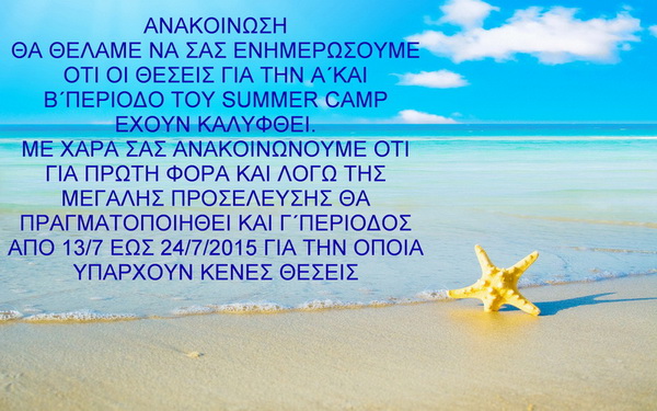 ΘΑ ΘΕΛΑΜΕ ΝΑ ΣΑΣ ΕΝΗΜΕΡΩΣΟΥΜΕ ΟΤΙ ΟΙ ΘΕΣΕΙΣ ΓΙΑ ΤΗΝ Α΄ΚΑΙ Β΄ΠΕΡΙΟΔΟ ΤΟΥ SUMMER CAMP ΕΧΟΥΝ ΚΑΛΥΦΘΕΙ.
