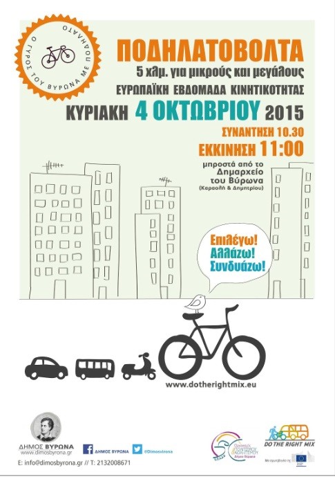 Ο Δήμος Βύρωνα και ο Οργανισμός Πολιτισμού & Αθλητισμού, θέλοντας να δώσει στους δημότες - μικρούς και μεγάλους - τη δυνατότητα μιας ποδηλατικής βόλτας στο κέντρο της πόλης, διοργανώνει την 2η ποδηλατοδρομία του, την Κυριακή 04/10/2015 10:30 π.μ. μπροστά από το Δημαρχείο του Βύρωνα. Η ποδηλατοβόλτα θα ξεκινήσει στις 11:00.