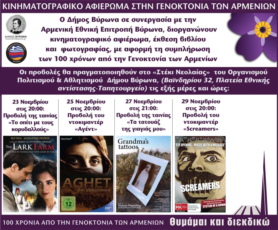 Ο Δήμος Βύρωνα, σε συνεργασία με την Αρμενική Εθνική Επιτροπή Βύρωνα, διοργανώνουν κινηματογραφικό αφιέρωμα, έκθεση βιβλίου και φωτογραφίας, με αφορμή τη συμπλήρωση των 100 χρόνων από τη Γενοκτονία των Αρμενίων.