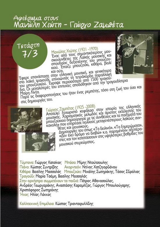 Πολιτιστικές Βραδιές: Τετάρτη 07/03: Αφιέρωμα στους Μανώλη Χιώτη - Γιώργο Ζαμπέτα