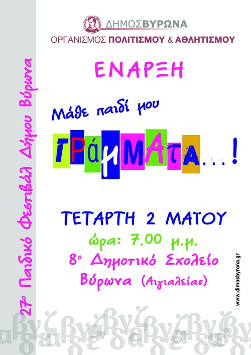 Την έναρξη του Παιδικού Φεστιβάλ θα κηρύξει ο Δήμαρχος Βύρωνα Νίκος Χαρδαλιάς την Τετάρτη 2 Μαΐου, στις 7 το απόγευμα, στο 8ο Δημοτικό Σχολείο Βύρωνα. Στο πλαίσιο της πρώτης αυτής εκδήλωσης, θα παρακολουθήσουμε τραγούδια από τη χορωδία του «Χαμόγελου του Παιδιού», ενώ οι μαθητές του 8ου Δημοτικού θα παρουσιάσουν τη μουσική παράσταση «Ταξίδι στο μαγικό κόσμο της Μουσικής» και ένα αφιέρωμα στον Μάρκο Βαμβακάρη και το ρεμπέτικο τραγούδι. Παράλληλα, παραδοσιακούς χορούς θα παρουσιάσουν οι μαθητές του 6ου & 7ου Δημοτικού Σχολείου.