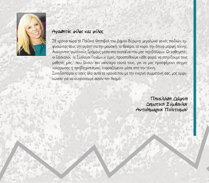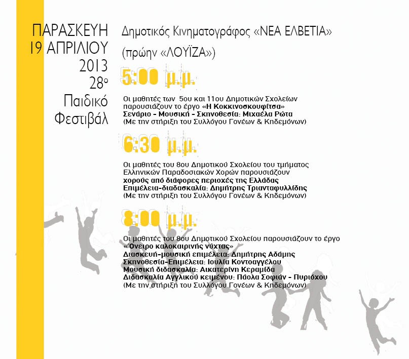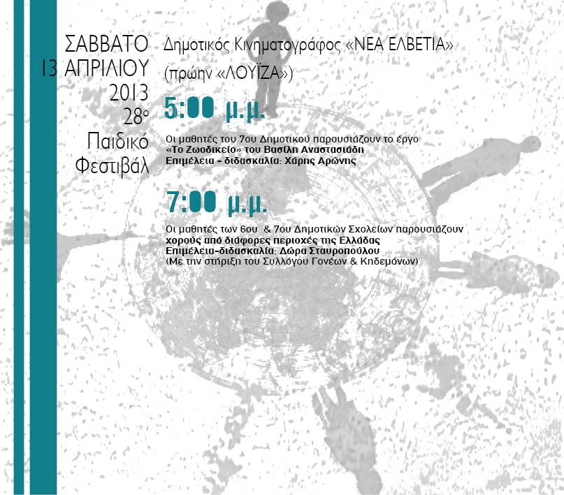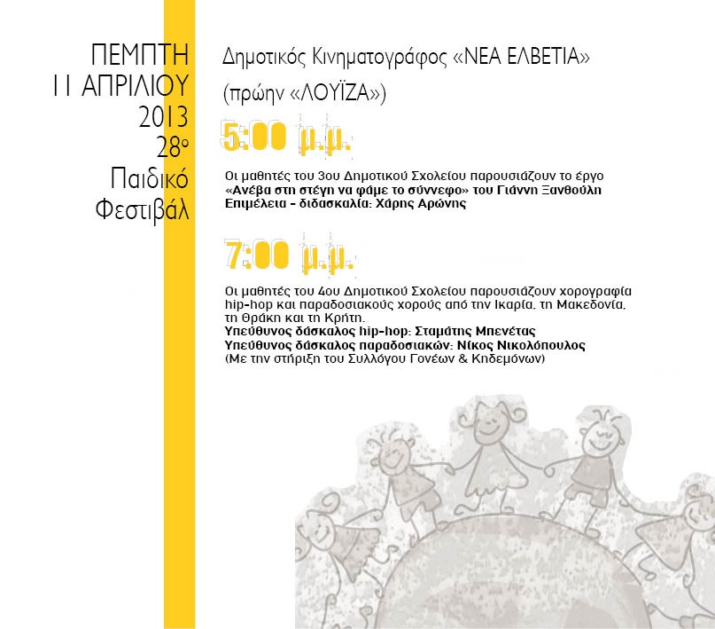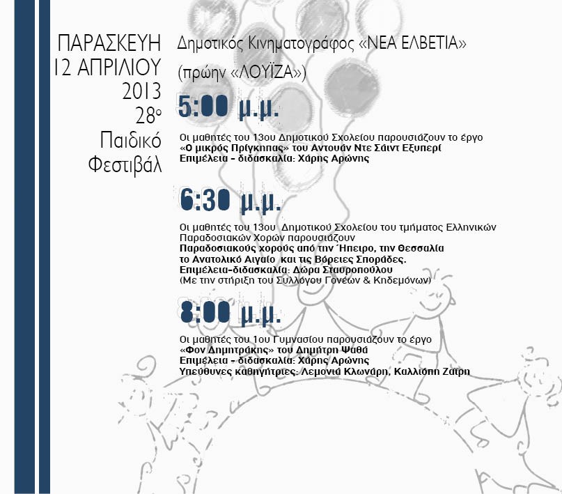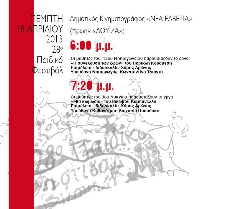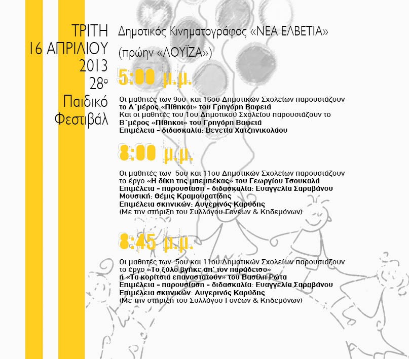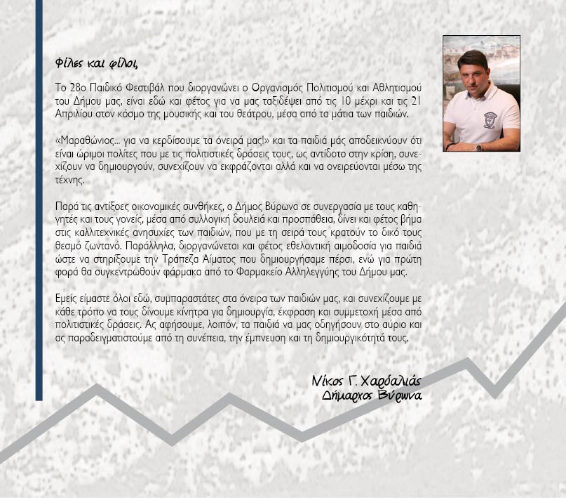 Το 28ο Παιδικό Φεστιβάλ που διοργανώνει ο Οργανισμός Πολιτισμού και Αθλητισμού του Δήμου μας, είναι εδώ και φέτος για να μας ταξιδέψει από τις 10 μέχρι και τις 21 Απριλίου στον κόσμο της μουσικής και του θεάτρου, μέσα από τα μάτια των παιδιών...