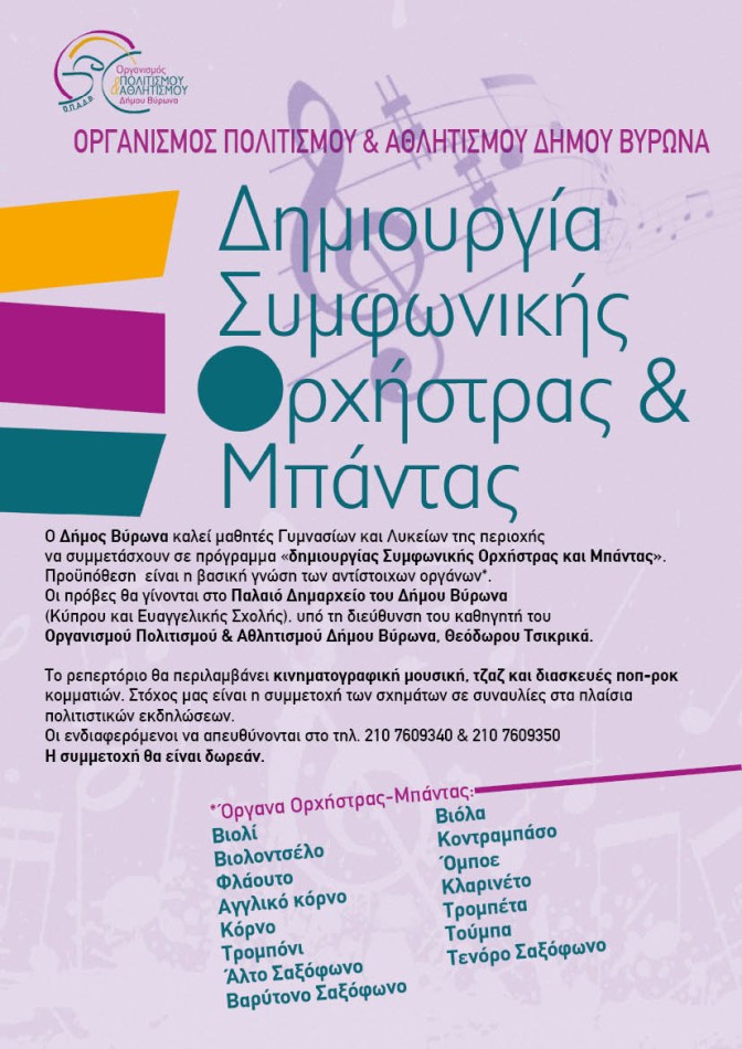 Ο Δήμος Βύρωνα καλεί μαθητές Γυμνασίων και Λυκείων της περιοχής να συμμετάσχουν σε πρόγραμμα δημιουργίας Συμφωνικής Ορχήστρας και Μπάντας.