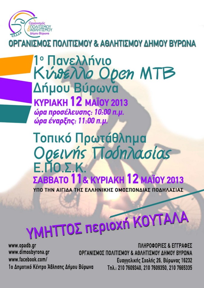 Το 1ο Πανελλήνιο Κύπελλο Open MTB (Mountain Bike) Δήμου Βύρωνα και το Τοπικό Πρωτάθλημα Ορεινής Ποδηλασίας διοργανώνει ο Οργανισμός Πολιτισμού και Αθλητισμού του Δήμου μας σε συνεργασία με την Ελληνική Ομοσπονδία Ποδηλασίας, το Σάββατο 11 και την Κυριακή 12 Μαΐου, στον Κουταλά.