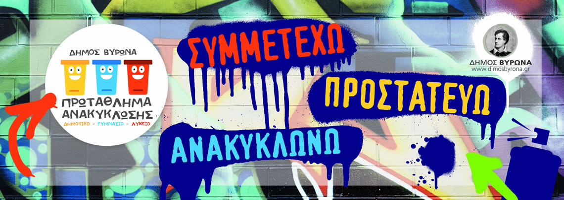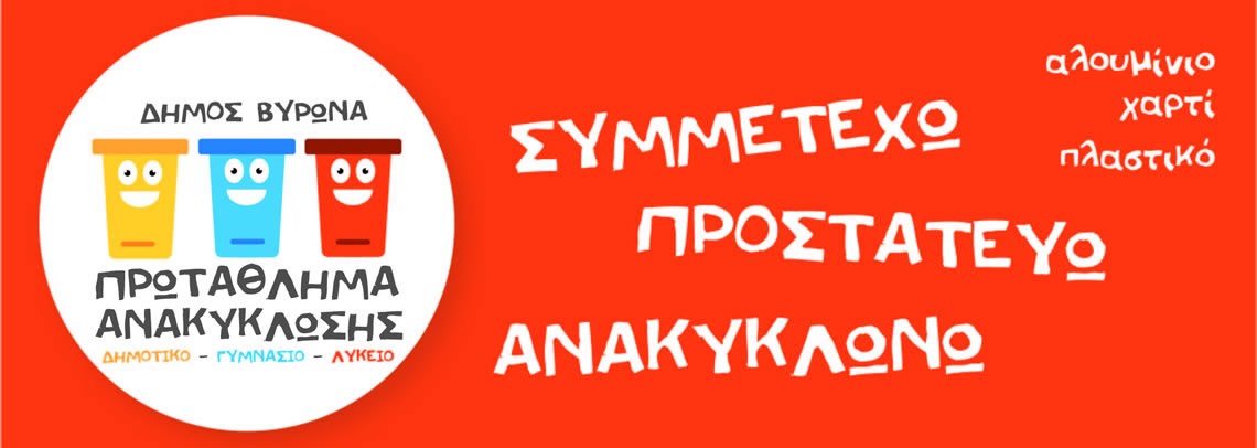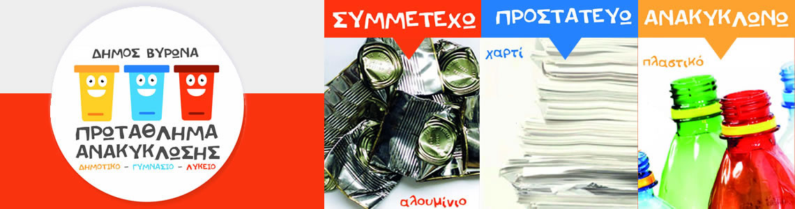 “Ο Δήμος Βύρωνα διοργανώνει πρωτάθλημα ανακύκλωσης με τη συμμετοχή των σχολείων της περιοχής μας με κεντρικό σύνθημα «Συμμετέχω, Προστατεύω, Ανακυκλώνω». Ο διαγωνισμός ξεκινάει με την έναρξη της σχολικής χρονιάς και ολοκληρώνεται με το τέλος της. Στο διαγωνισμό λαμβάνουν μέρος όλες οι εκπαιδευτικές βαθμίδες (Δημοτικά, Γυμνάσια και Λύκεια) του Δήμου.